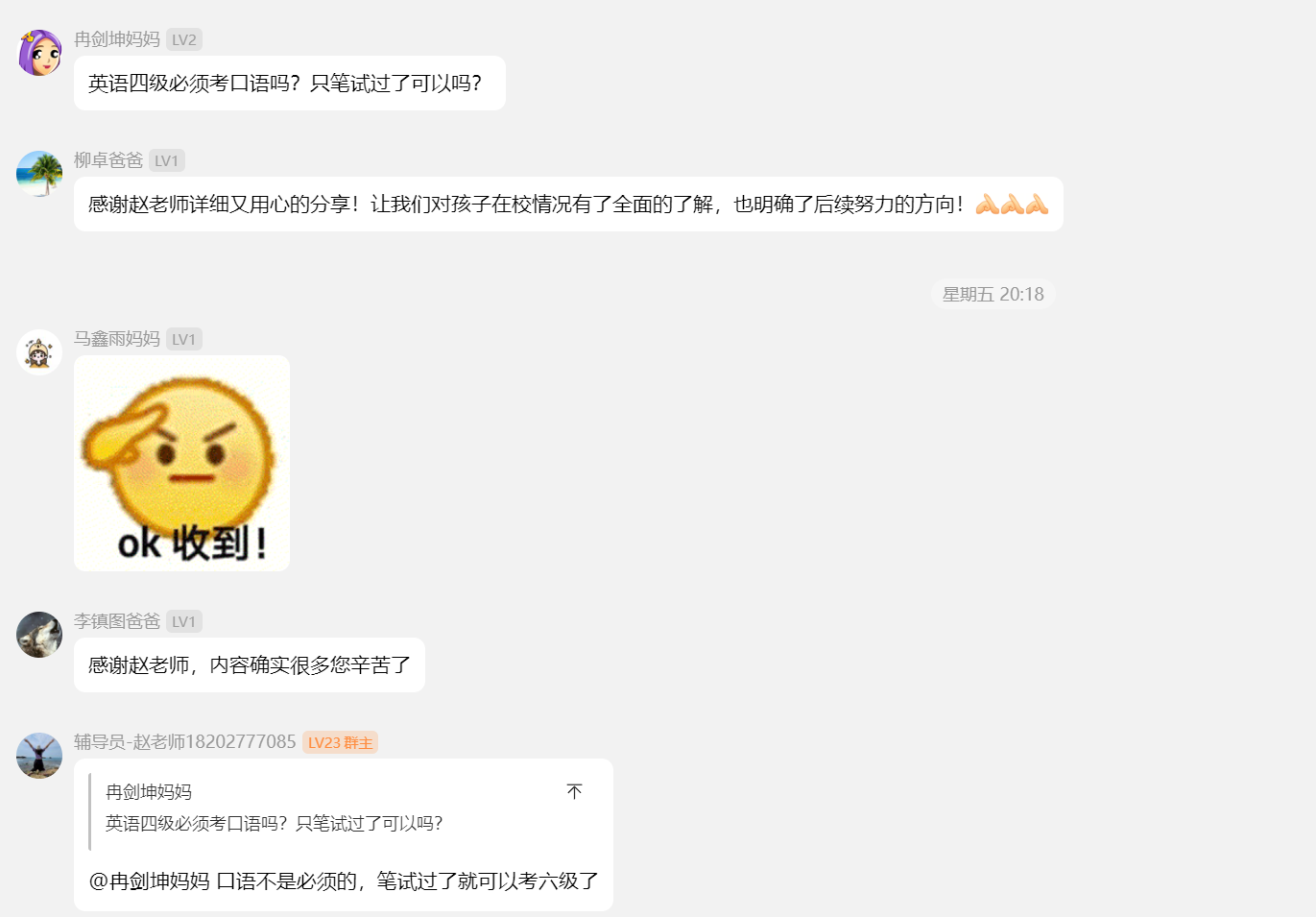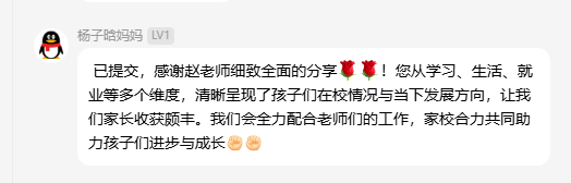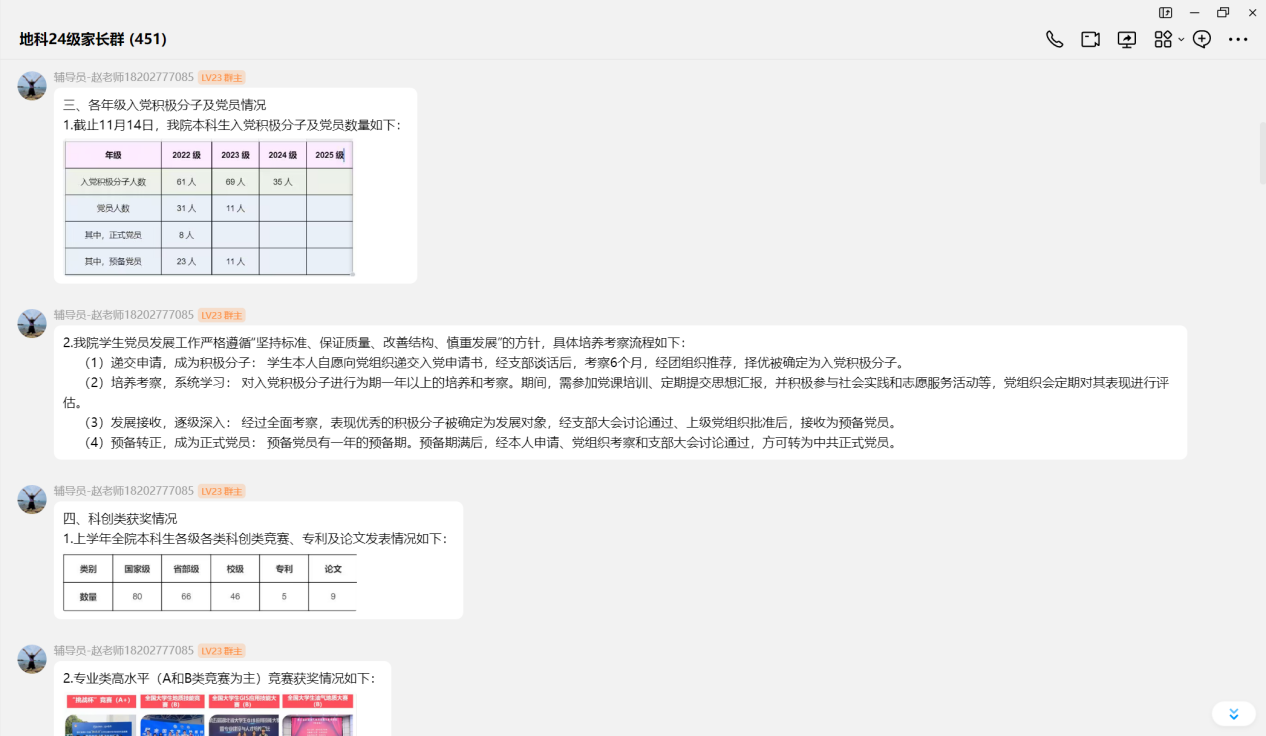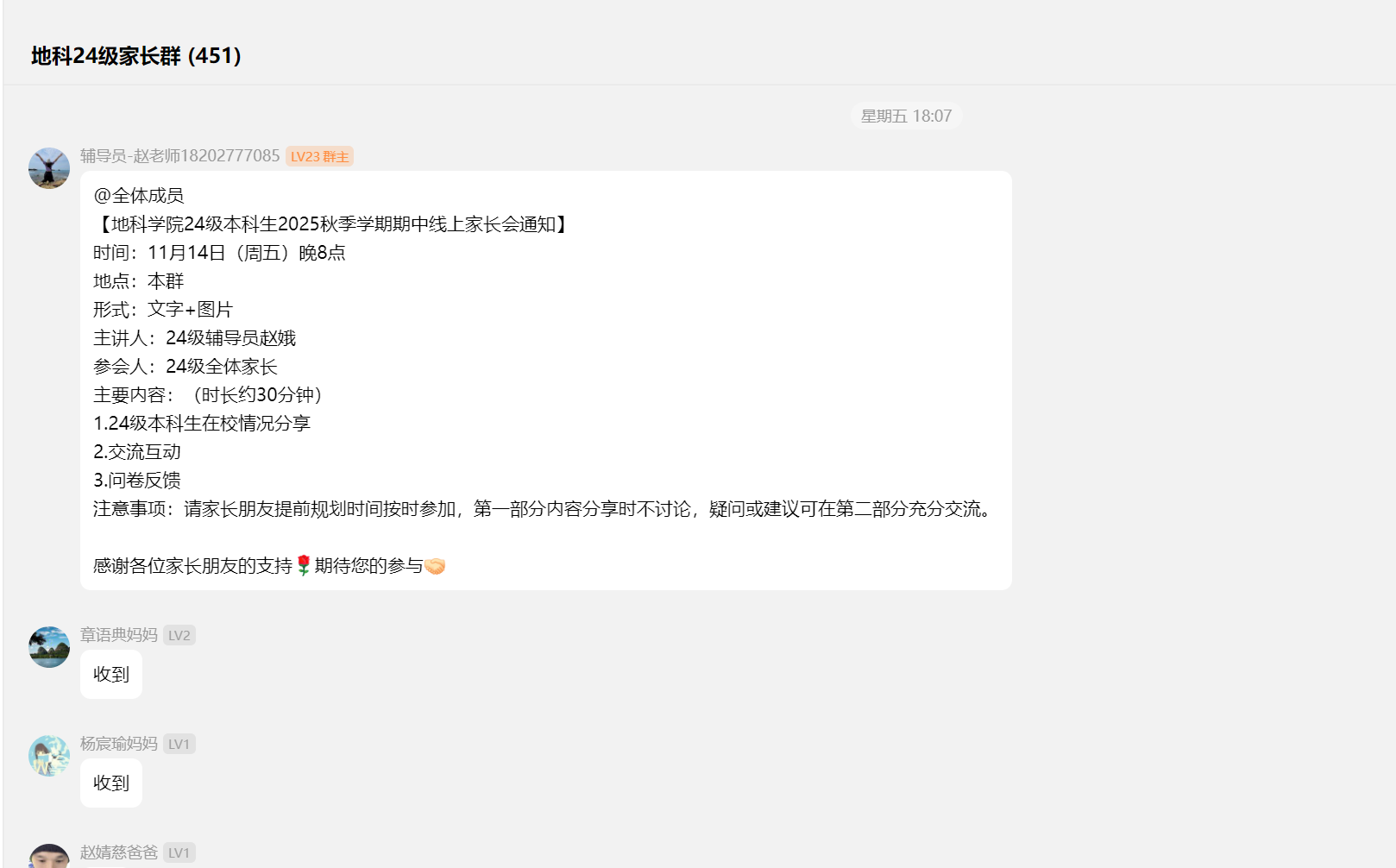 (通讯员 王彩蓓)为进一步加强家校之间的沟通与协作,构建家校共育的桥梁,共同促进员工全面成长与未来发展,11月14日晚8点,公司24级本科生本学期期中线上家长会顺利开展。会议由辅导员赵娥老师主讲,全体24级家长参与。 会议从家长关心的学业成绩、评奖评优、学科竞赛等方面展开,向家长们展示了学院持续强化学风建设,通过课堂考勤与学业帮扶机制关注员工成长,并呼吁家长共同督促员工重视英语四级考试与专业学习。在思想引领与成长支持方面,学院严格规范党员发展流程,并通过心理关怀、宿舍文明建设及丰富多彩的科创、心育活动为员工营造积极健康的成长环境。同时,会议结合近年考研趋势与就业形势,建议家长引导员工尽早明确生涯规划,扎实学业基础,提升综合竞争力。 交流答疑环节,家长们就英语四六级、孩子专业以后的就业方向等问题踊跃提问,赵老师就家长们关心的问题进行了耐心、细致的解答,获得了家长们的一致好评。 此次线上家长会,虽隔屏幕,却未阻隔家校心连心的交流。它不仅让家长们对孩子的在校情况有了更立体的了解,也进一步明确了家校合作发力的方向。我们坚信,唯有家校同心,携手并进,方能共同托举起孩子们更加光明、灿烂的未来! (编辑 郭霖 审核 冯舒)