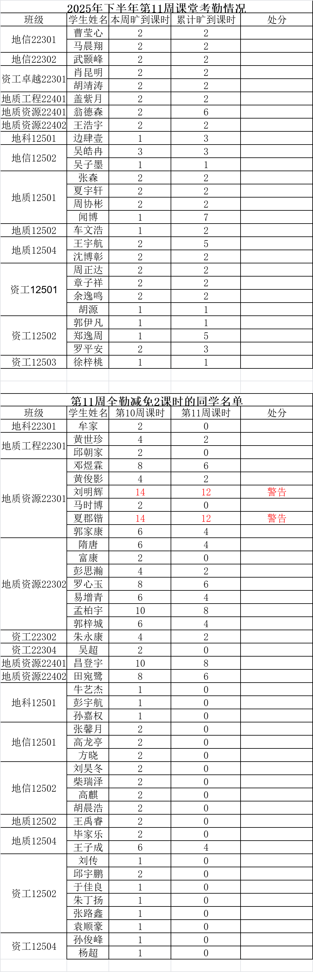 1. 旷课达到12学时,给予警告处分;