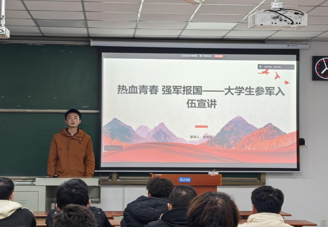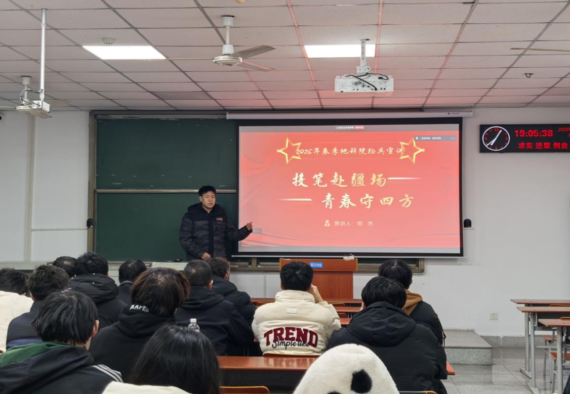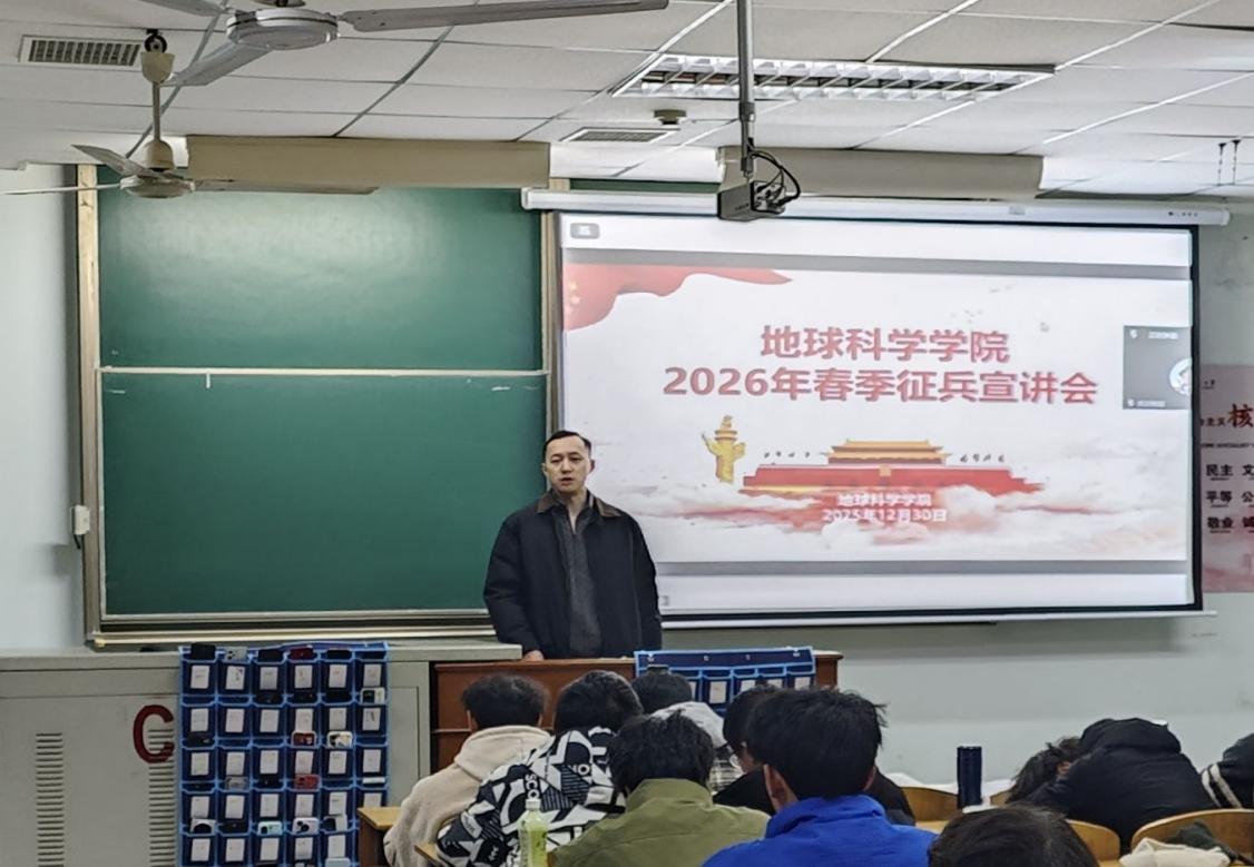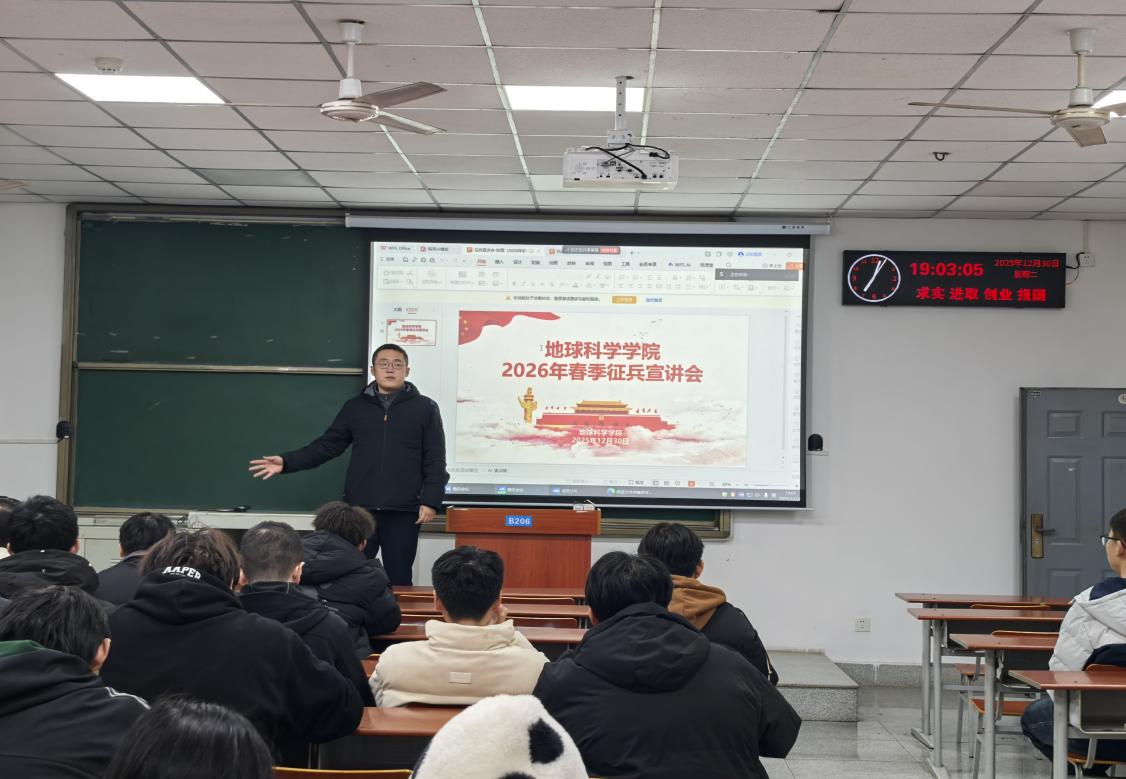 (通讯员 黄瑱 邢佰诗 李雨泽/摄)为深入贯彻落实国家征兵政策,激发在校老员工携笔从戎、报效祖国的热情。12月30日晚19:00,地科学院2026年春季征兵宣讲会在武教B206以线上线下融合方式举行。会议由退伍士兵地信22401班彭郝毅、资工22304班郑杰担任主讲,辅导员乔宇、黄瑱于武汉和荆州校区同步主持,400余名员工参与活动。