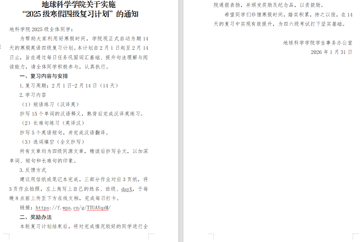 在内容安排上,本次复习以学院精心编写的“2026年寒假英语加油包”为核心,内容紧密对接四级考试要求:选用真题同源文章,帮助员工提前适应考题文体;提炼高频热点词汇,强化核心表达积累;解析长难句结构,提升阅读理解能力;并设置选词填空练习,推动“学—练—用”闭环,巩固学习成效。整套复习方案旨在巩固员工既有复习成果,系统提升应考能力。在督学机制上,由学院兼职辅导员、各班班长每日定时发布任务,员工于晚8时前完成并上传至指定平台,班导随即检查当日完成情况,做到“任务不过夜”;同时,辅导员、班主任开展定期检查,向家长群同步学习进展,形成全过程管理闭环。