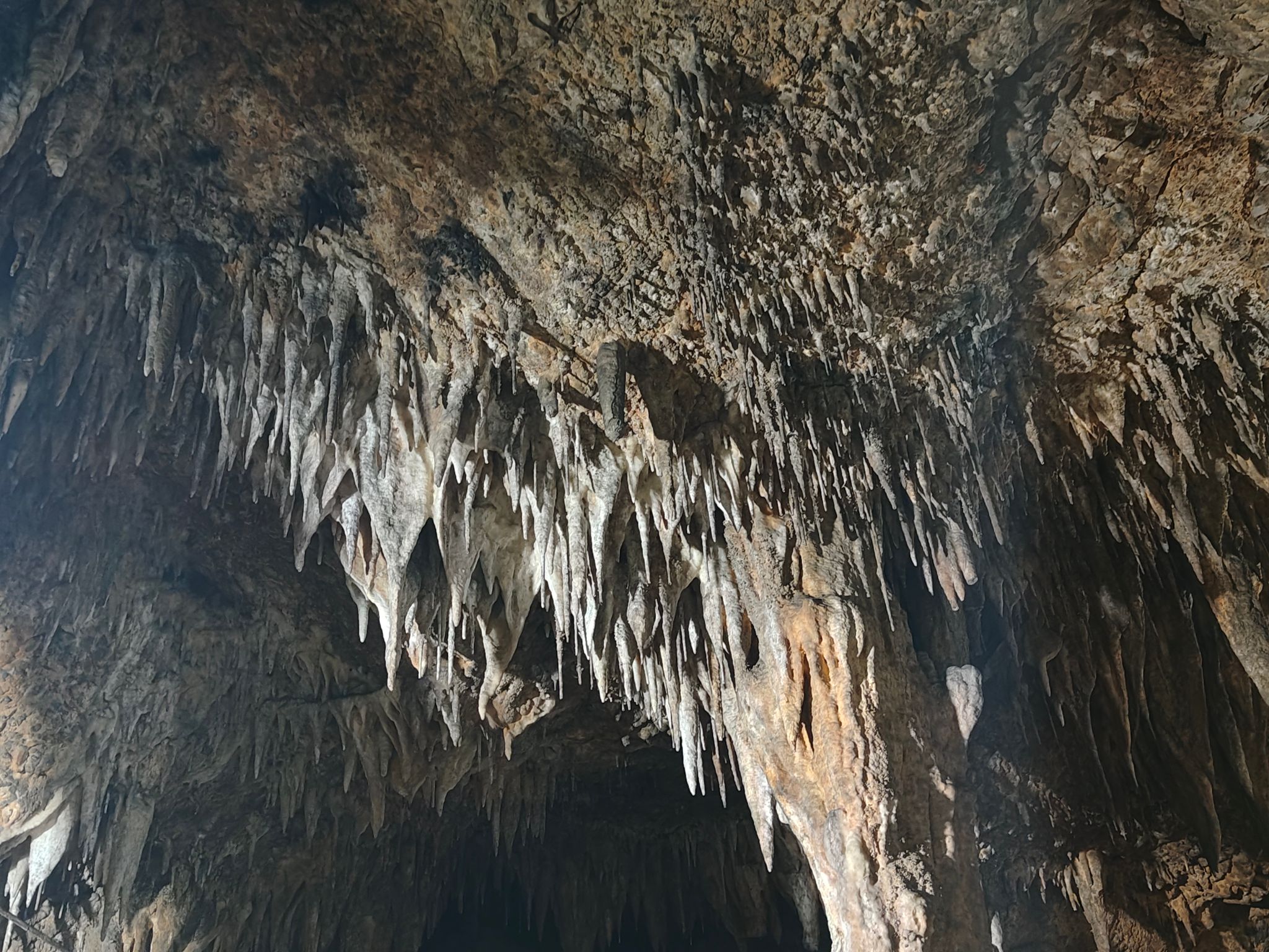 踏入古神洞的瞬间,我们仿佛闯入了另一个世界。洞顶垂落的钟乳石如冰锥般密集,在灯光下泛着温润的光泽——这是碳酸钙水溶液千万年滴落、沉积的杰作。老师告诉我们,每一根钟乳石的生长都以毫米计,需要上万年甚至更久的时光,才能从洞顶垂落,与地面的石笋相遇,最终连成石柱。这些形态各异的碳酸钙沉积,无声诉说着这里曾经的地下河环境,也让我真切感受到“地质时间”的漫长与厚重。